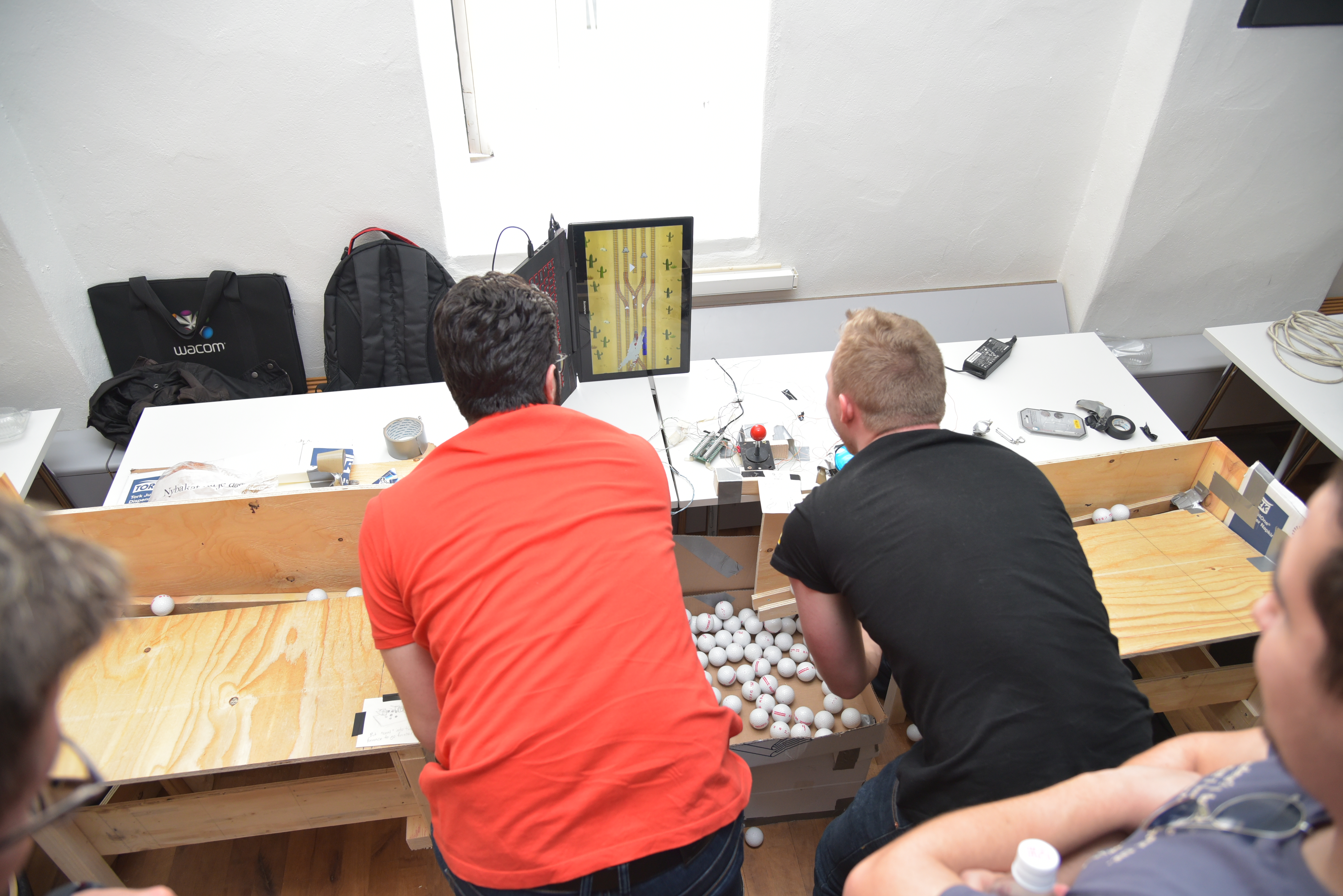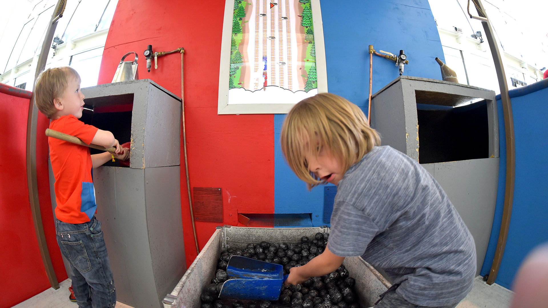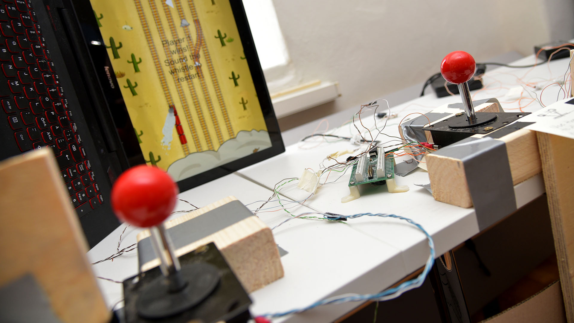 is a game that mixes the shoveling of coal, into a wild west era locomotive, with railroad switching. We wanted to bring a fast-paced experience into the arcade world. The two players compete to not get caught by the bandits at the bottom of the screen.